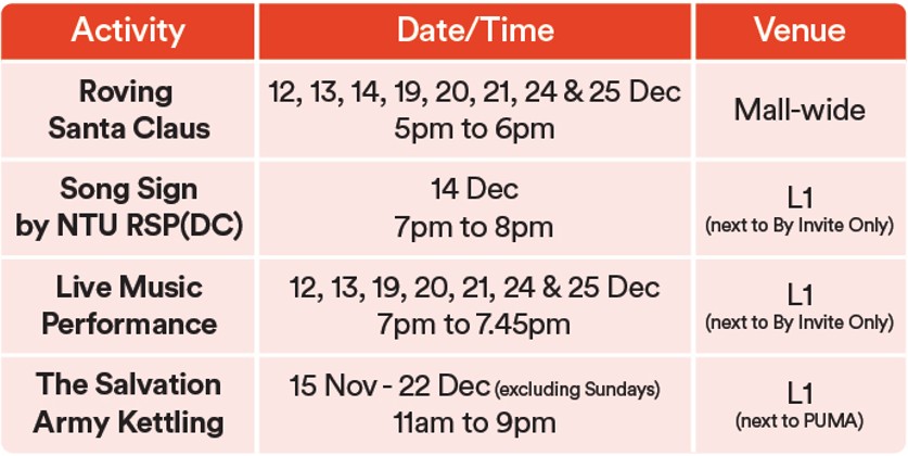 Come and join the festive fun filled with live music and cheerful visits from Santa Claus.